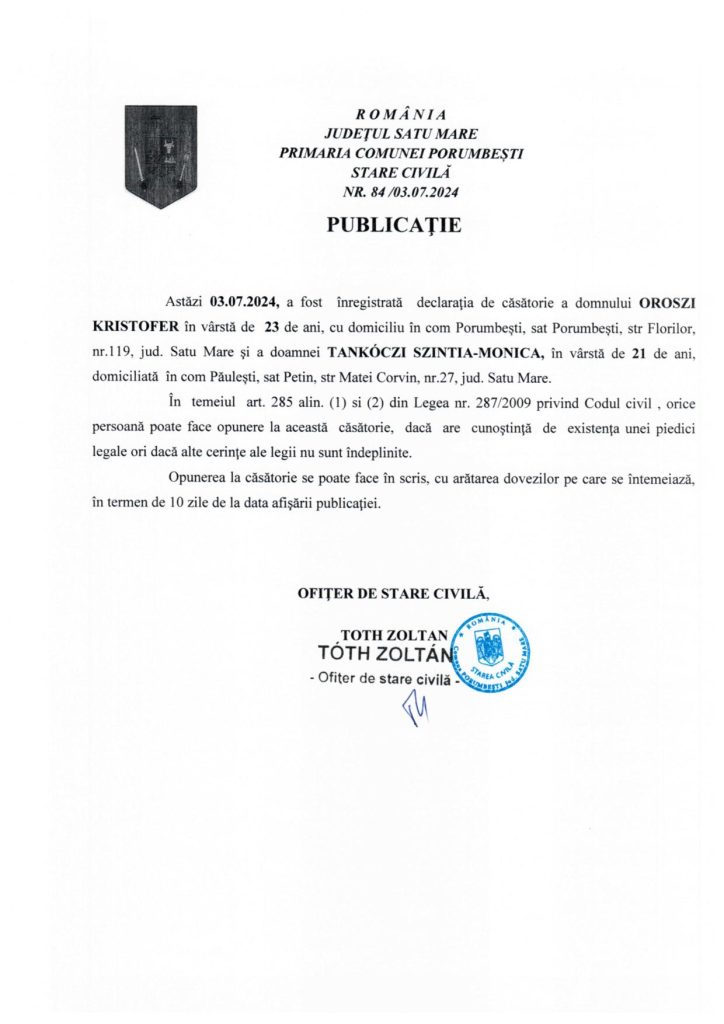 04 iul. Publicatie casatorie Oroszi Kristofer si Tankoczi Szintia Posted at 11:11h in Publicatii de casatorie 2024 by lacikasimon Descarcare pdf: Publicatie casatorie Oroszi Kristofer si Tankoczi Szintia Print page