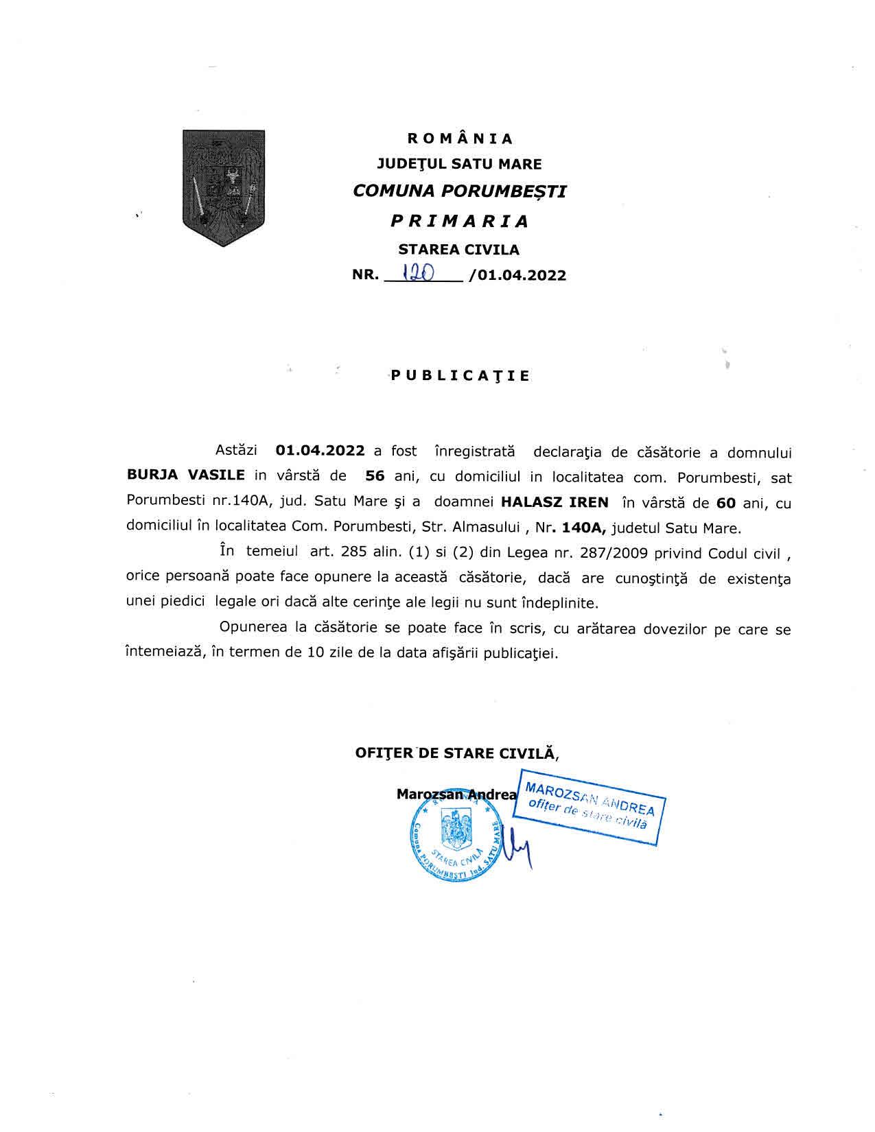 04 apr. Publicatie casatorie 01-04-2022
